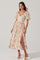 A woman is wearing a long, flowy dress with a floral pattern. The dress features puffed short sleeves, a fitted bodice with smocking detail, and a skirt that reaches mid-calf. The fabric has a light background with pink and green floral prints. She is also wearing beige high-heeled sandals.